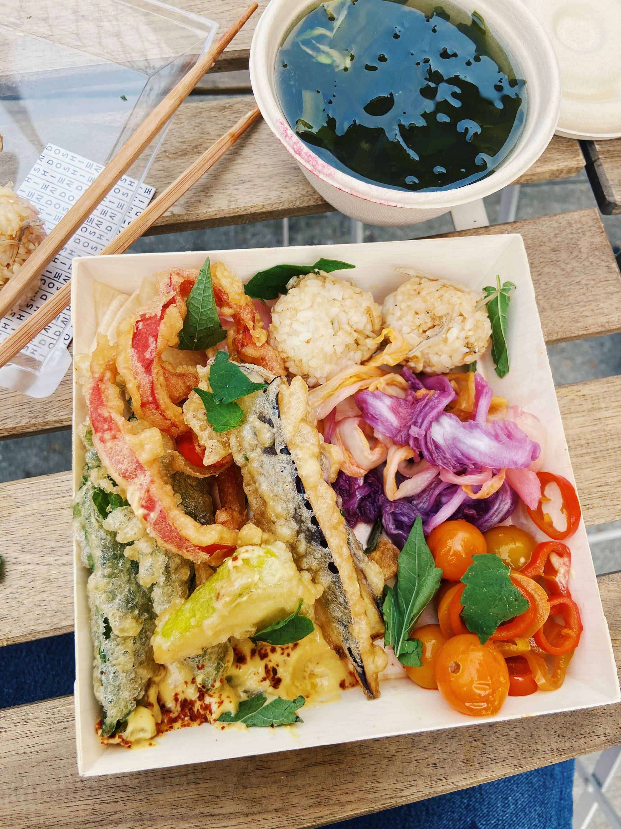 crispy fried vegetables with a corn daenjang sesame dipping sauce, anchovy walnut candy rice balls, baek kimchi and icy seaweed broth from @eatdoshi, the Fleetwood Mac of pop-ups.
