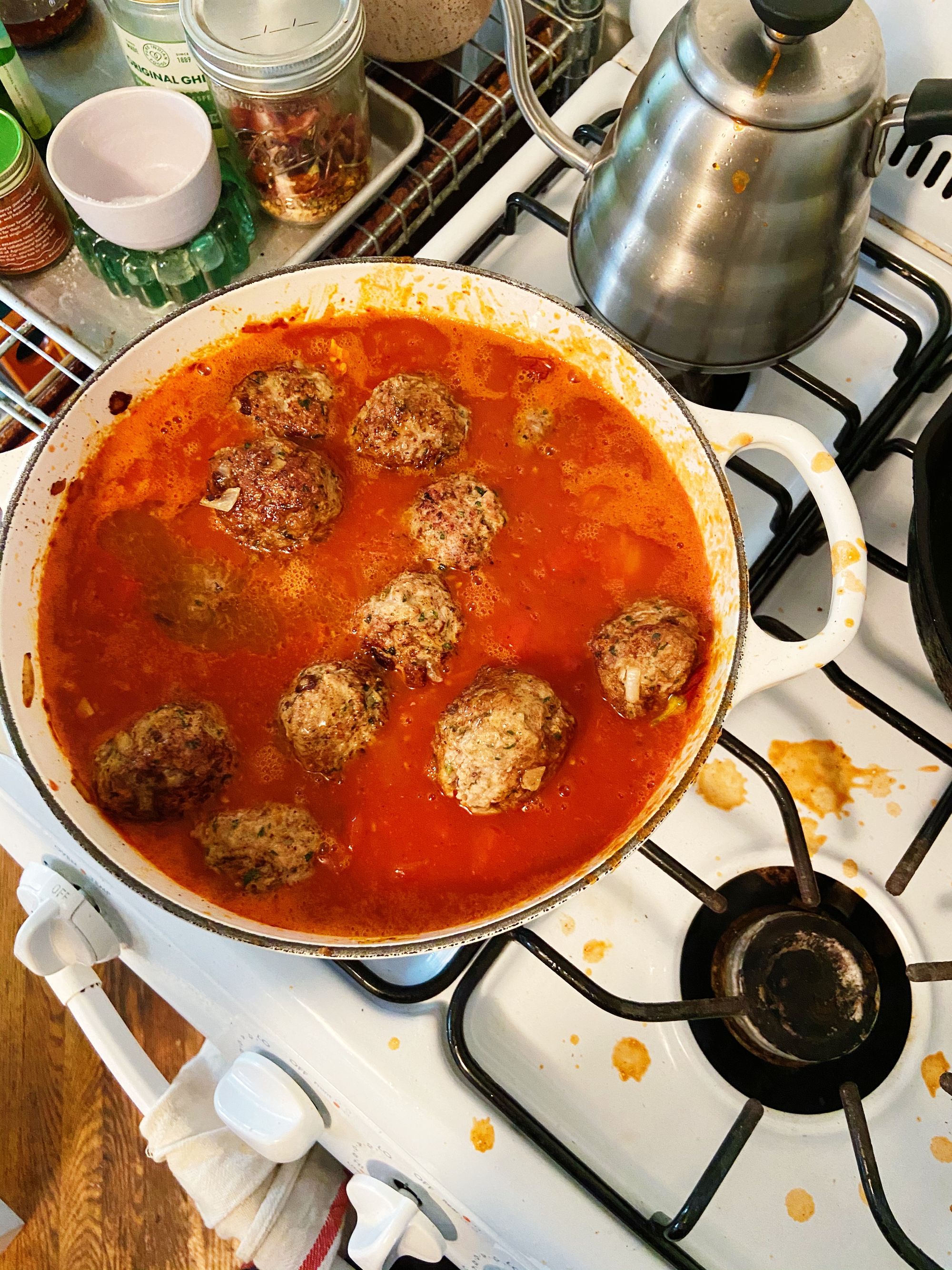 I have tested them in multiple ovens in different homes, and either coincidentally ALL the ovens absolutely suck, or this method isn’t great (unless you’re doing meatballs for a LOT of people). Doing them in a pot is more work, sure, but I do think you reap the rewards in the form of fat and juicy bits and browned, delicious meat that all flavor your tomato sauce as you finish gently cooking those meatballs.