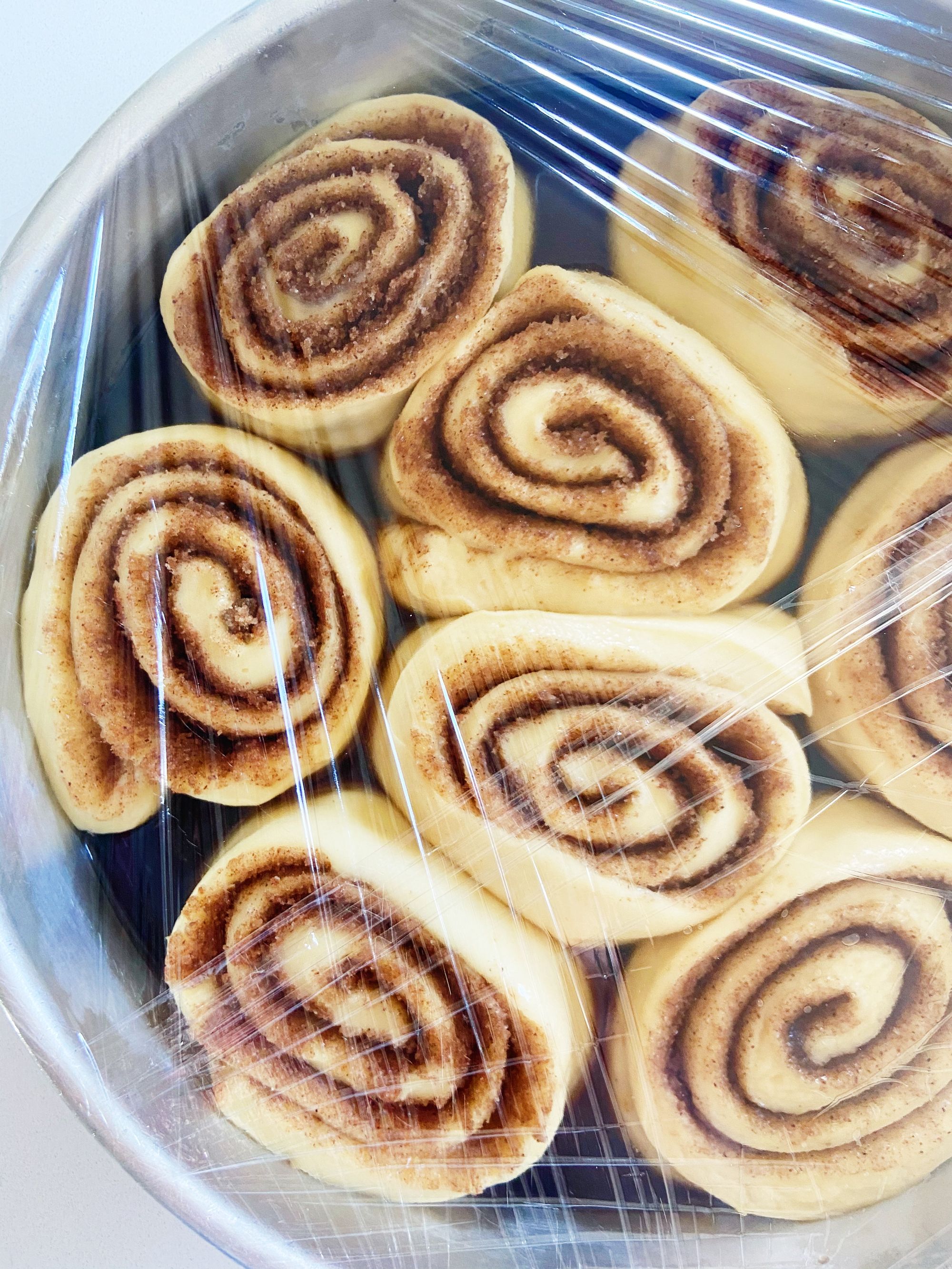 15. Preheat oven to 350°. Place your wrapped pan of cinnamon rolls in a gently warm place (on top of the oven, fridge or radiator are popular places) and let the rolls proof, looking puffy and almost doubled in size, 30–35 minutes— they should definitely all be touching now. (If your rolls are coming directly from the fridge, this may take closer to 50–60 minutes.)