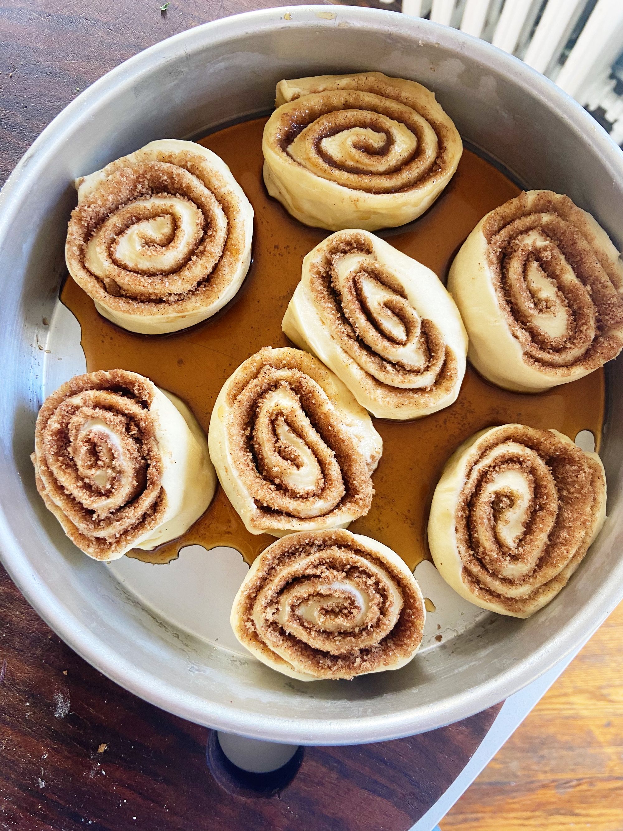 13. Place cinnamon rolls in your baking dish or cake pans. They should be pretty spaced apart and might appear a little sparse or lonely-- don’t worry, they will get closer as they proof and even closer when they bake.