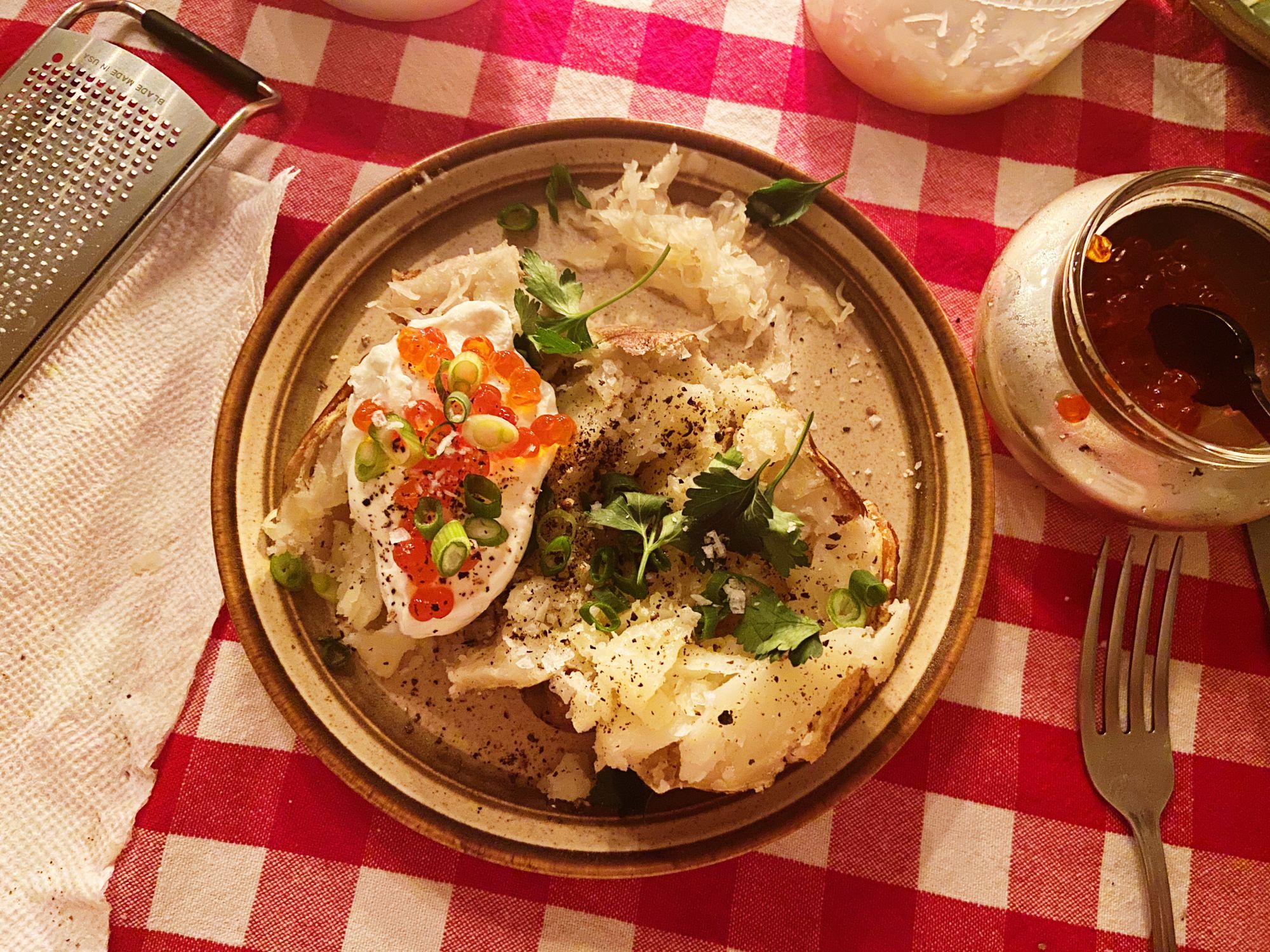 Rub russet potatoes with vegetable oil and prick them all over with a fork or knife (safely, please). Place them directly on the rack of a 500° oven until super crispy on the outside and very fluffy on the inside, about an hour. Split them open the regular way (lengthwise) and eat them with all your toppings, which include but are not limited to: salmon or trout roe (caviar if you can), sour cream, sliced chives or scallion, salted butter, more salt (flaky), cracked black pepper, chopped dill or parsley (both) and a pile of sauerkraut.