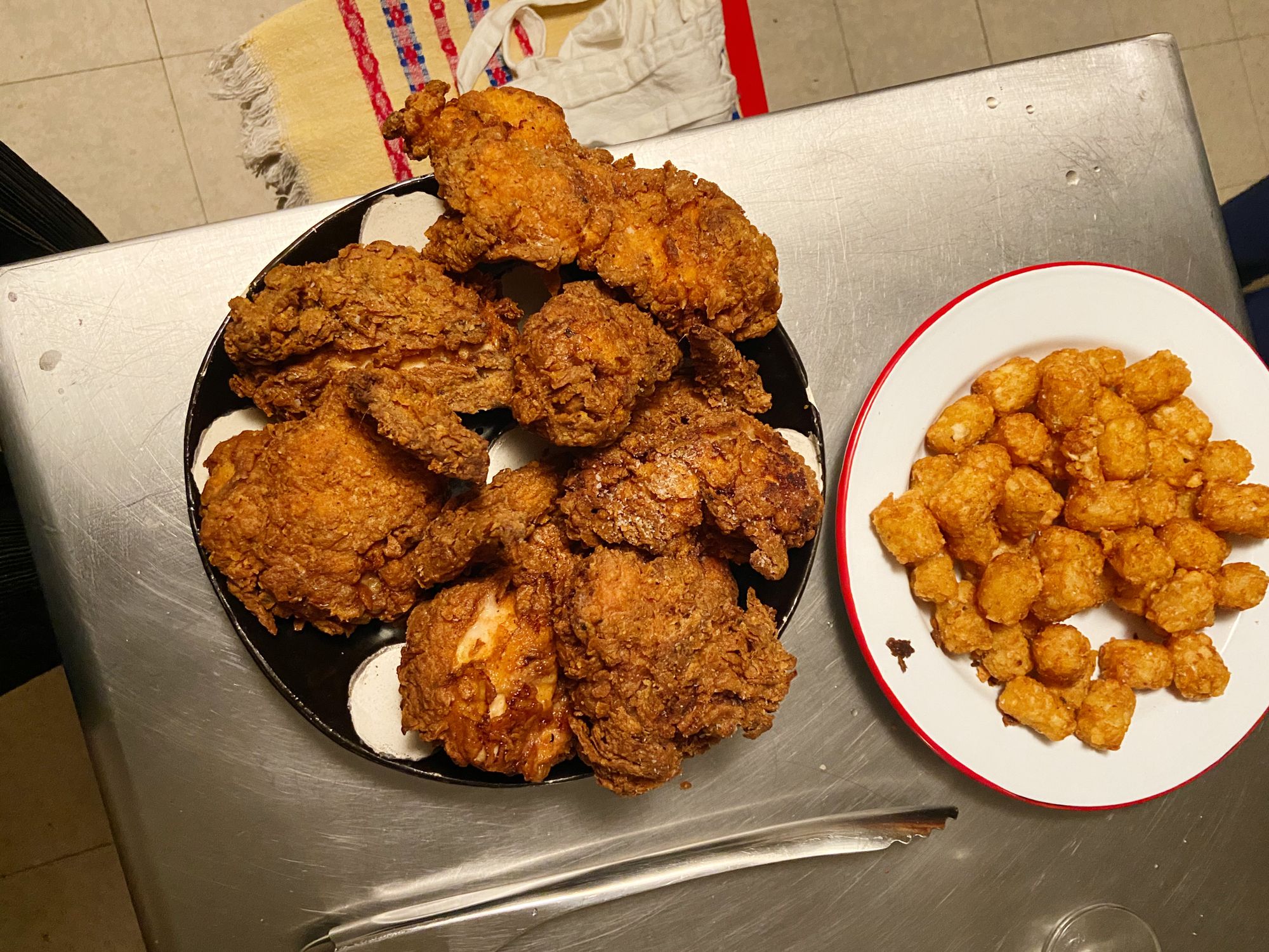 I soaked a cut-up chicken (bone-in, skin-on) in a mixture of buttermilk, kosher salt, hot sauce, and kimchi liquid (for saltiness, spiciness, and lactic acid) and let it sit there all day. For dinner, I tossed it into a mixture of flour, cornstarch, kosher salt, garlic powder (!!), smoked paprika, and lots of black pepper. I dipped the brined chicken into the flour mixture and pressed it on before shaking it off and dropping it into a pot of hot, neutral oil (no thermometer, but guessing it was around 375°). A good mantra when going through the trouble of frying something is “what else can we fry?” and our answer was: This bag of frozen tater tots. We ate our fried things with a very vinegary cabbage salad.