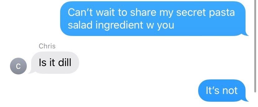 After the longest eight minutes of our lives I shouted “SUN-DRIED TOMATOES! THERE ARE SUN-DRIED TOMATOES IN THIS!” bracing myself for praise, possibly an award of some sort? I received neither. “Sun-dried tomatoes are like, already an ingredient in pasta salad. They *are* pasta salad.” Okay. Wow. “That’s not a secret ingredient at all.” WOW.