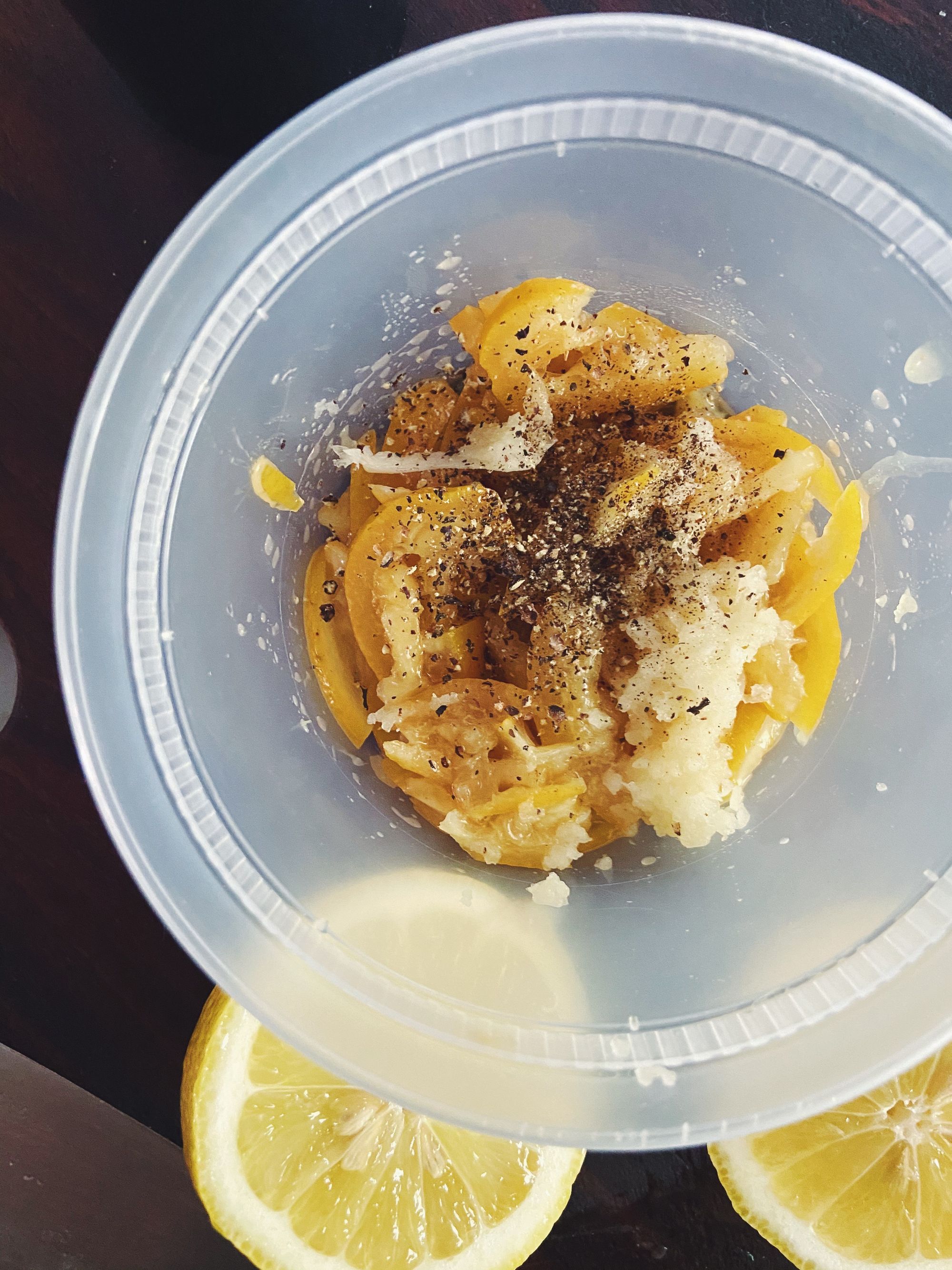 1. Combine preserved lemon, garlic and a few dashes of fish sauce in a large bowl. Add the juice of ½ a lemon and let sit a minute or two.