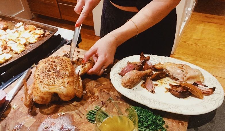 I took the chicken out of the oven and went to put clothes because try as I might, a towel is not a secure item of clothing and you really never know what will happen. I texted my sister, did two mini crosswords, drank some wine, folded my laundry, and came back to a well-rested chicken. I transferred the golden girl to a cutting board, tossed the torn bread in the juices and schmaltzy bits, and popped them back into the oven so they could turn into crispy, schmaltzy croutons.