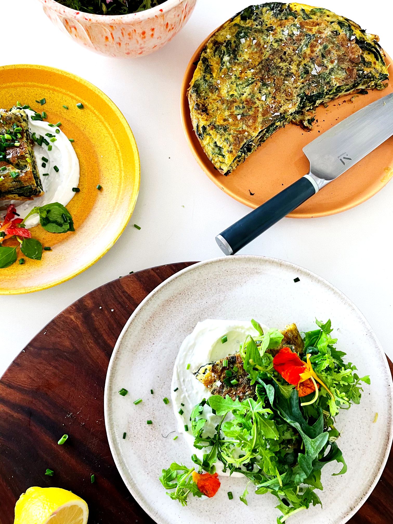To serve at home, whisk yogurt, garlic and lemon juice together in a small bowl and season with salt and pepper. Spoon this sauce onto a small plate, top with frittata and a scattering of leafy greens/tender herbs. Squeeze lemon and sprinkle flaky salt over everything before eating.