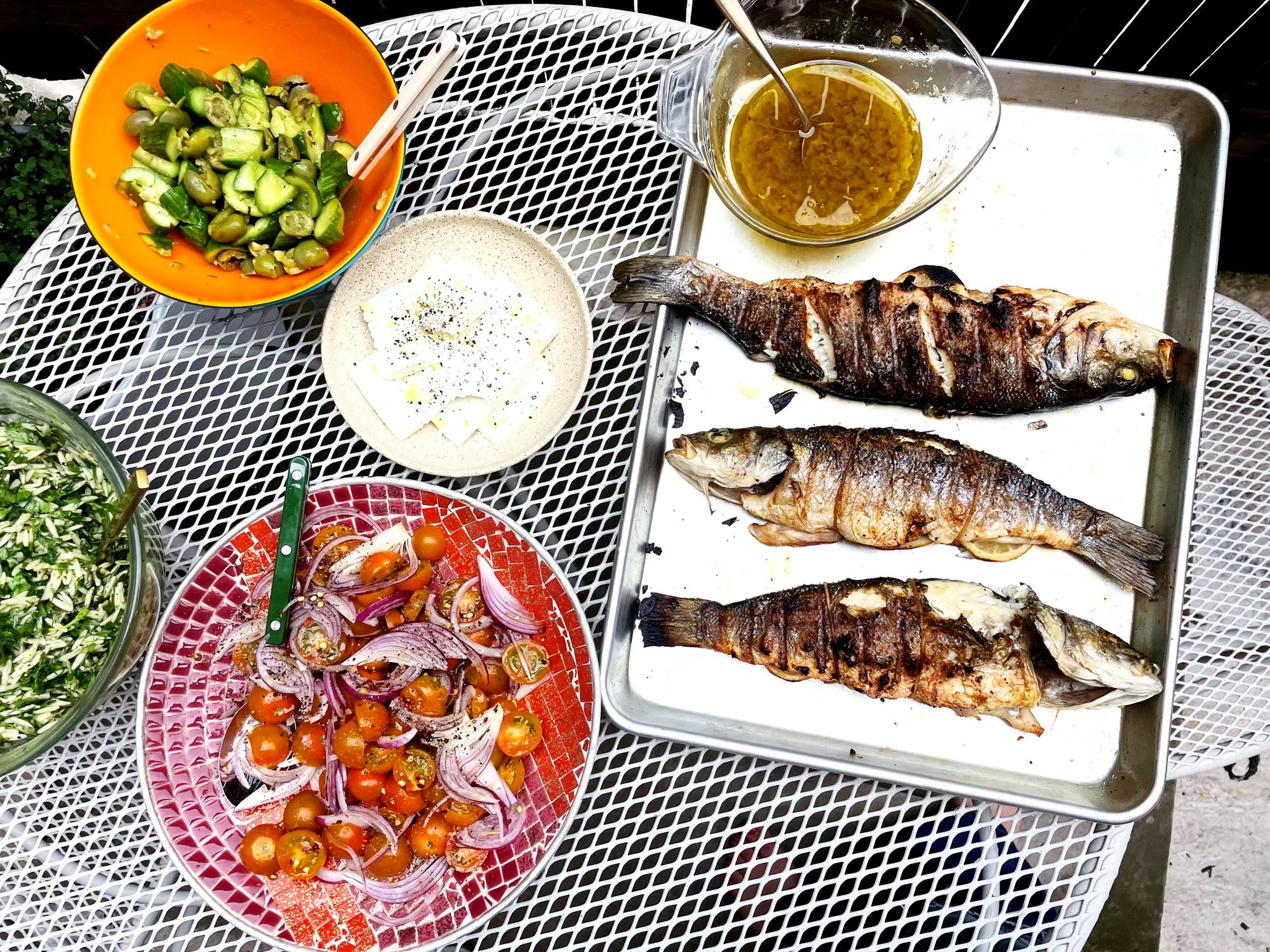 Grilled fish + something saucy (preserved lemon dressing) + an herby, starchy moment (orzo salad) + something crunchy and salty (crushed cucumbers and olives) + something sweet and sharp (tomatoes with sliced onions) + something creamy and fatty to snack on (sliced feta).