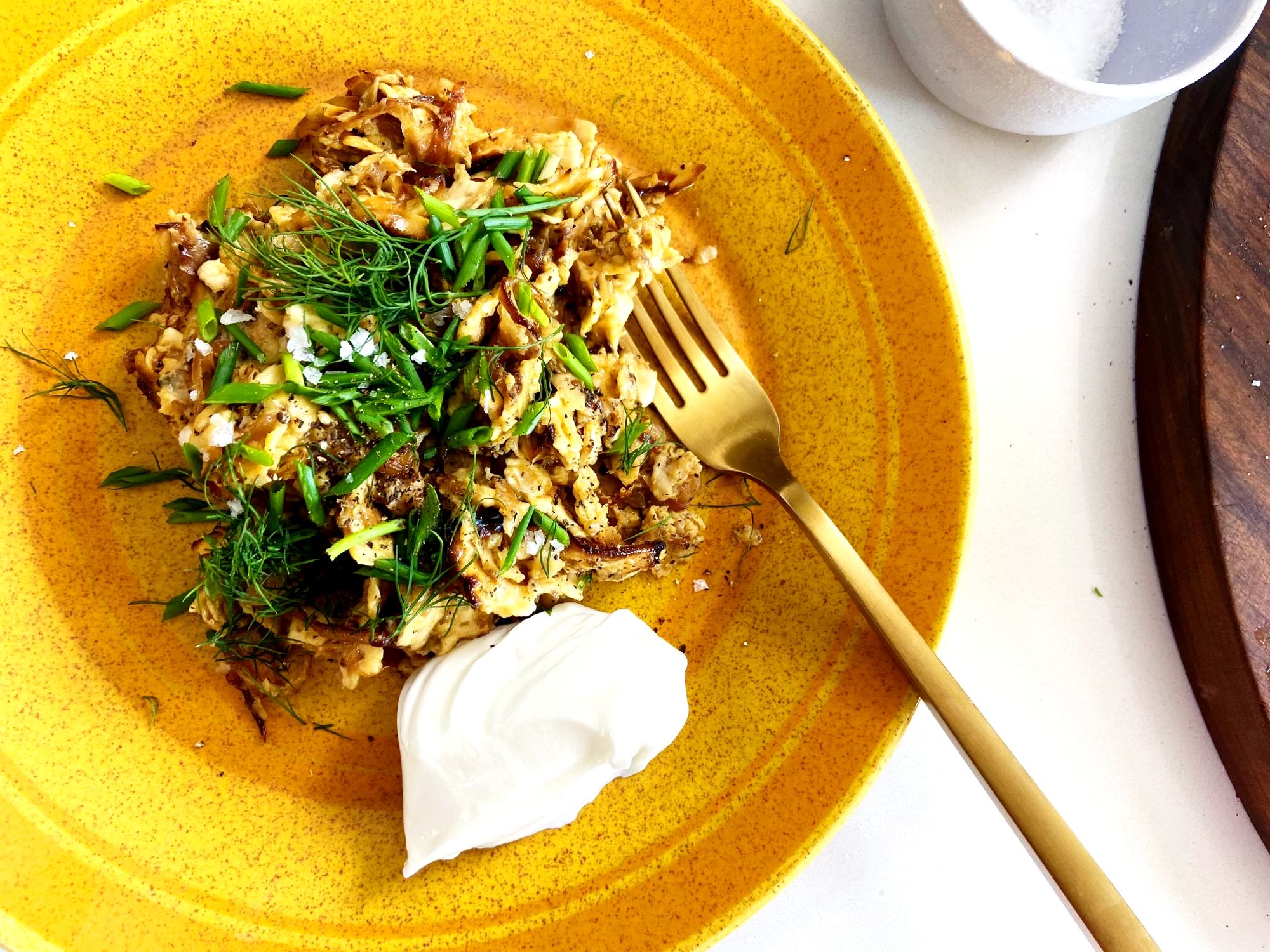 6. Remove from heat and finish with flaky salt and more pepper, shower with dill and chives if you’ve got ‘em. Serve with sour cream (or whatever you like).