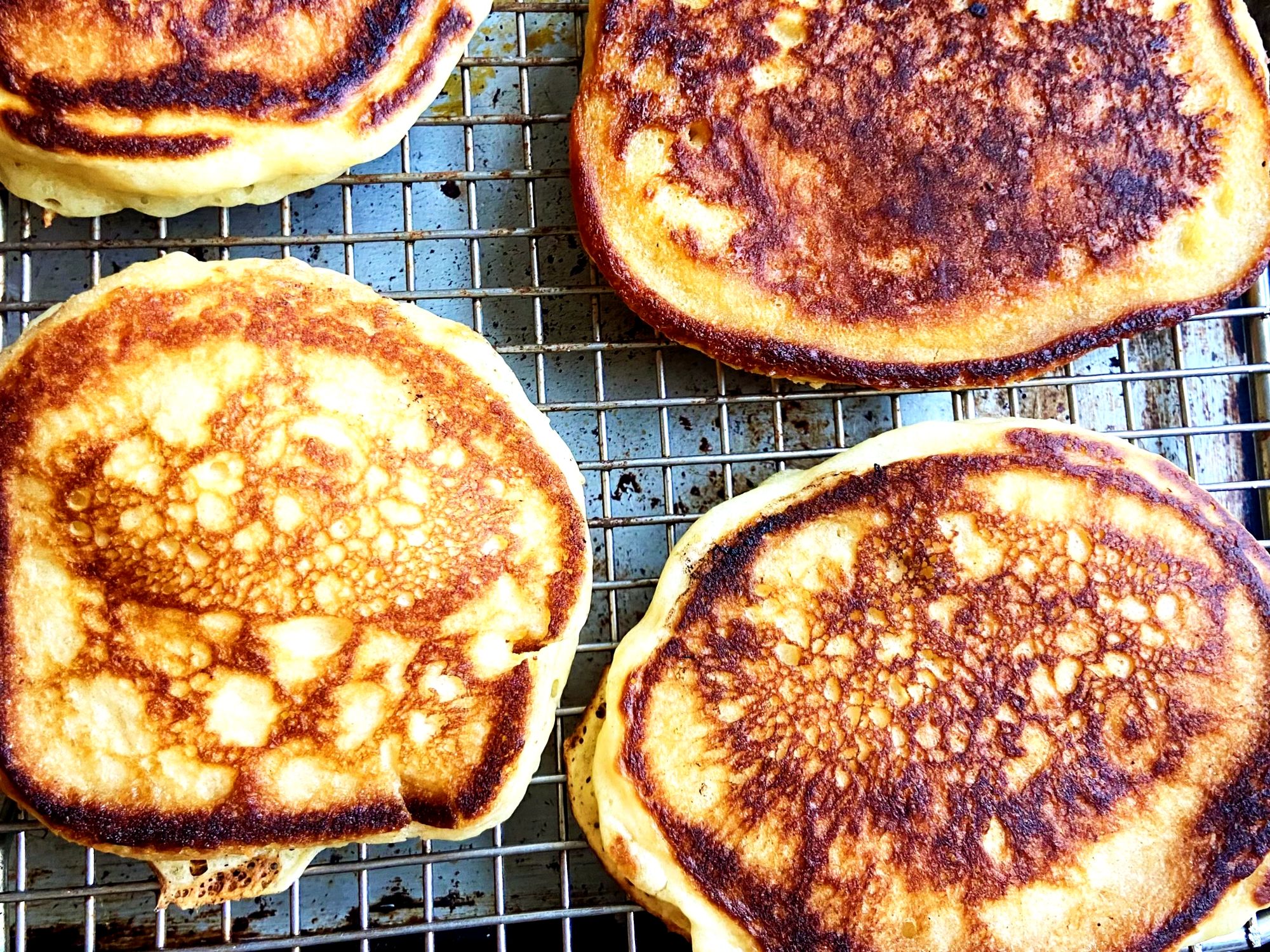 A perfect pancake should be almost more savory than sweet, with crispiness that rivals a waffle. These are that, but could also be described as fluffy, slightly eggy and “deeply breakfasty.” Don’t be discouraged if it takes more than one pancake to nail the heat of your skillet— every stove is different, and depending on the vessel you’re making them in, might require some adjustment.