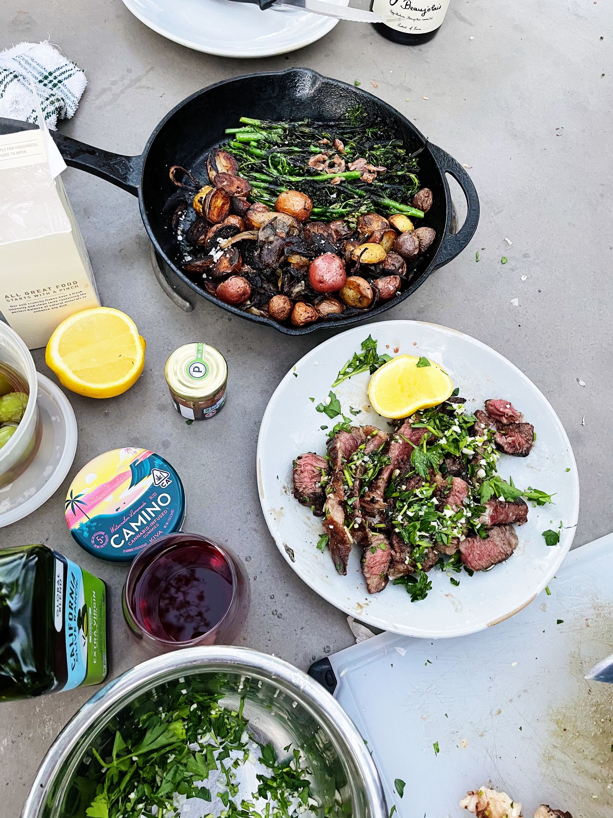 NIGHT ONE: steak, crushed potatoes, spicy broccolini. This felt like a good, basic, sort of special occasion WELCOME TO CAMPING dinner. One mistake of many I made was not bringing any kosher salt to cook with, but don’t worry, of course I purchased an entire box of Maldon salt, so that’s what we used to season all our food (no, this is not the first time I’ve made that mistake and no, I don’t recommend it). Anyway, we seasoned the steak (with maldon salt), then cooked some tiny potatoes and sliced onion in our one 10” skillet with olive oil and MALDON SALT until the onions were fried and frizzled and the potatoes were tender as can be, about 20 minutes (to expedite this, cover your potoates with foil and let them steam as they roast— we were not in a hurry). While this was happening, I grilled the broccolini right on the grates, moved them to the skillet with the potatoes to avoid using a plate, then added some chili flakes and a few anchovies because I am predictable.