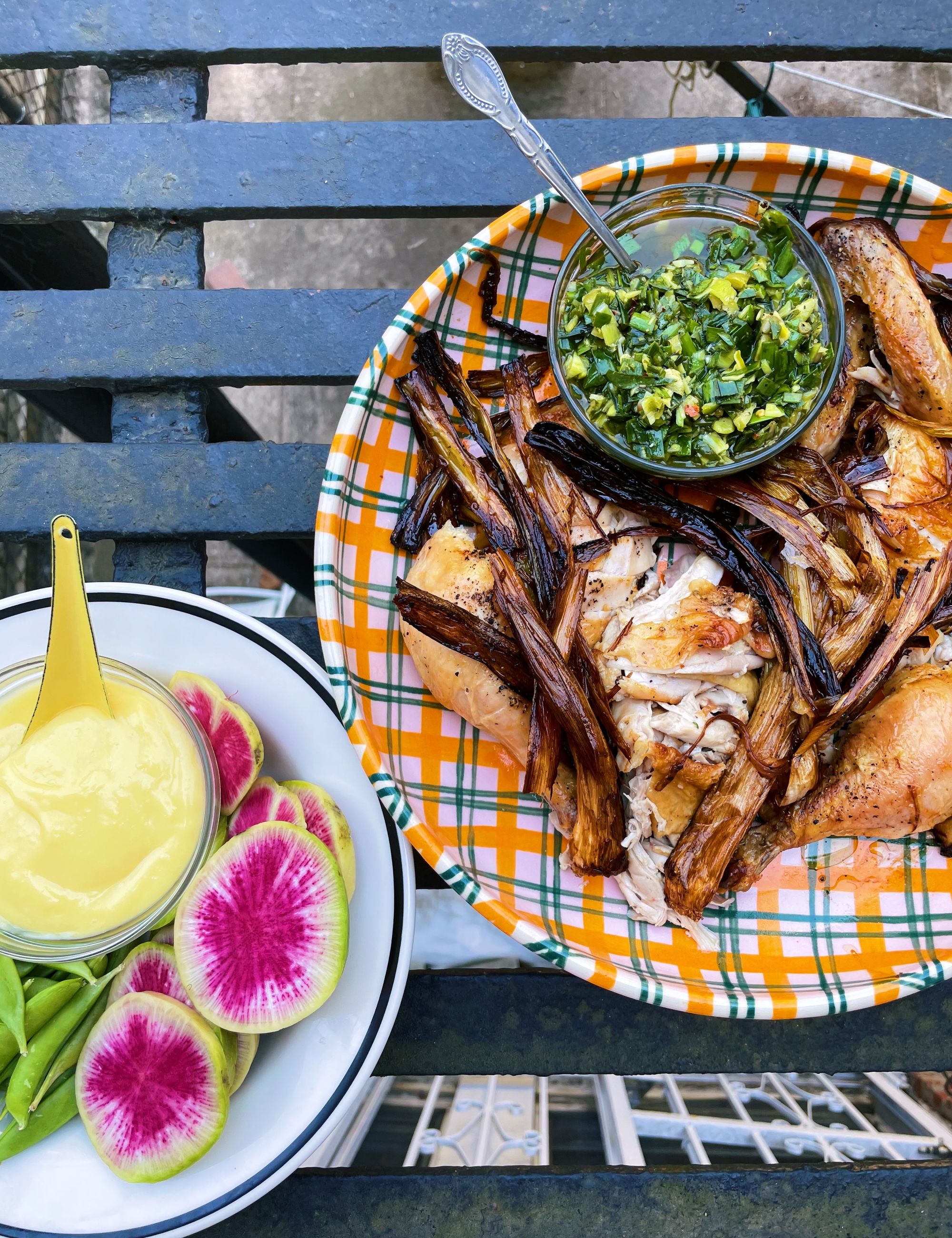 9. Serve with your leek salsa verde, aioli, and that celebration of spring (your vegetables). Dip the chicken into both sauces, followed by a perfect little boiled potato. Place an anchovy on a radish, dip that in the aioli. Snack on a lettuce. Drag a slice of chicken through the juices that have pooled on the bottom of the plate. Have a sip of wine, wish you had an artichoke, feel full and happy and grateful for all the things you have, but today, especially for spring and for that chicken.
