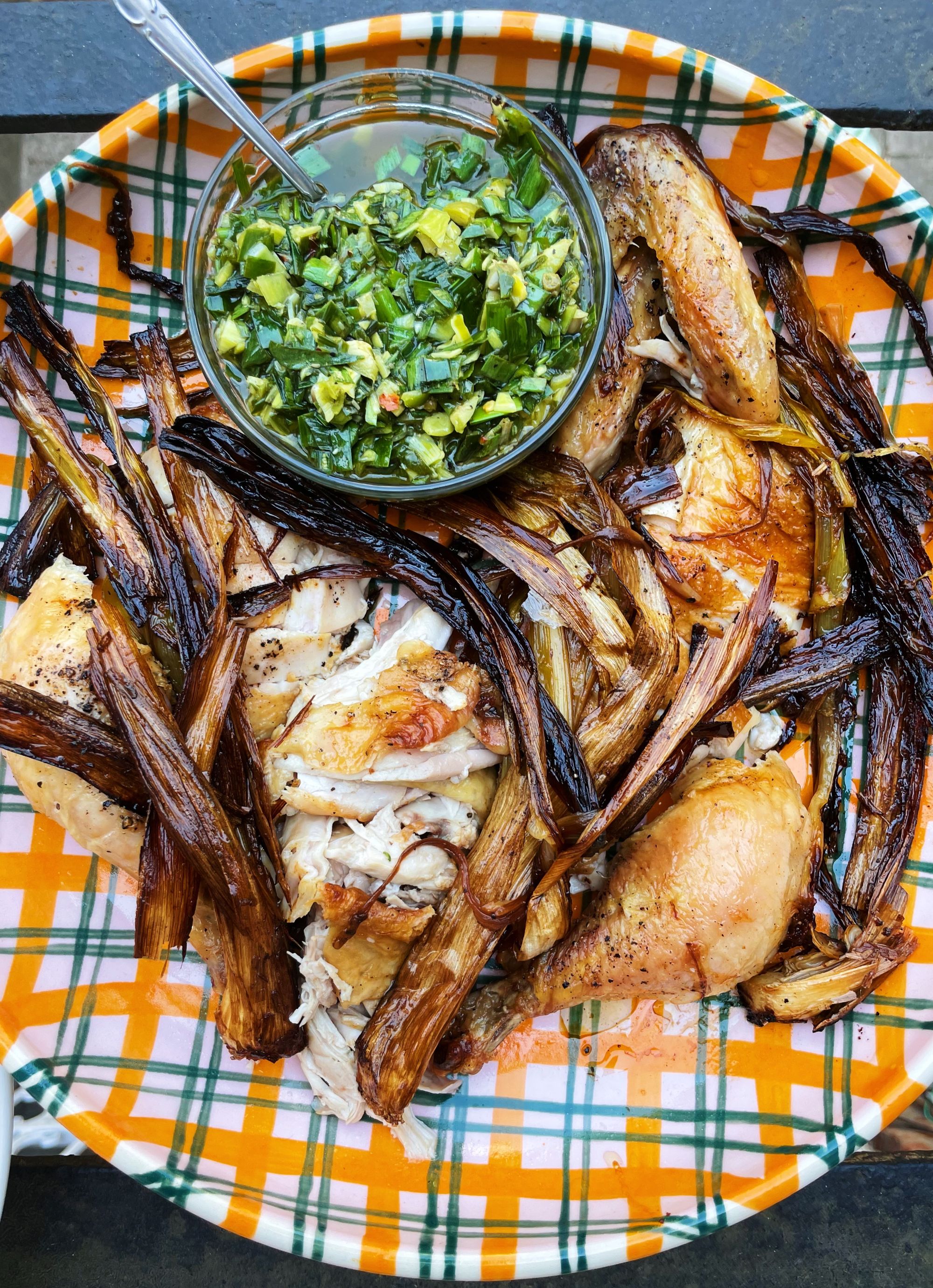 That all said, my favorite thing about this recipe is that it’s truly a full meal— a real “spring chicken dinner,” if you will. There’s the leek salsa verde: punchy, bright, and answers the question on everyone’s mind when cooking with leeks: wtf do I do with the dark green part? (The beloved PLS also bravely uses the whole leek, btw). You can make it without anchovies if you have yet to be indoctrinated into Anchovy Hive (we’re always looking for new members–inquire within!), but WOW are they good here, both in the sauce and on the side.