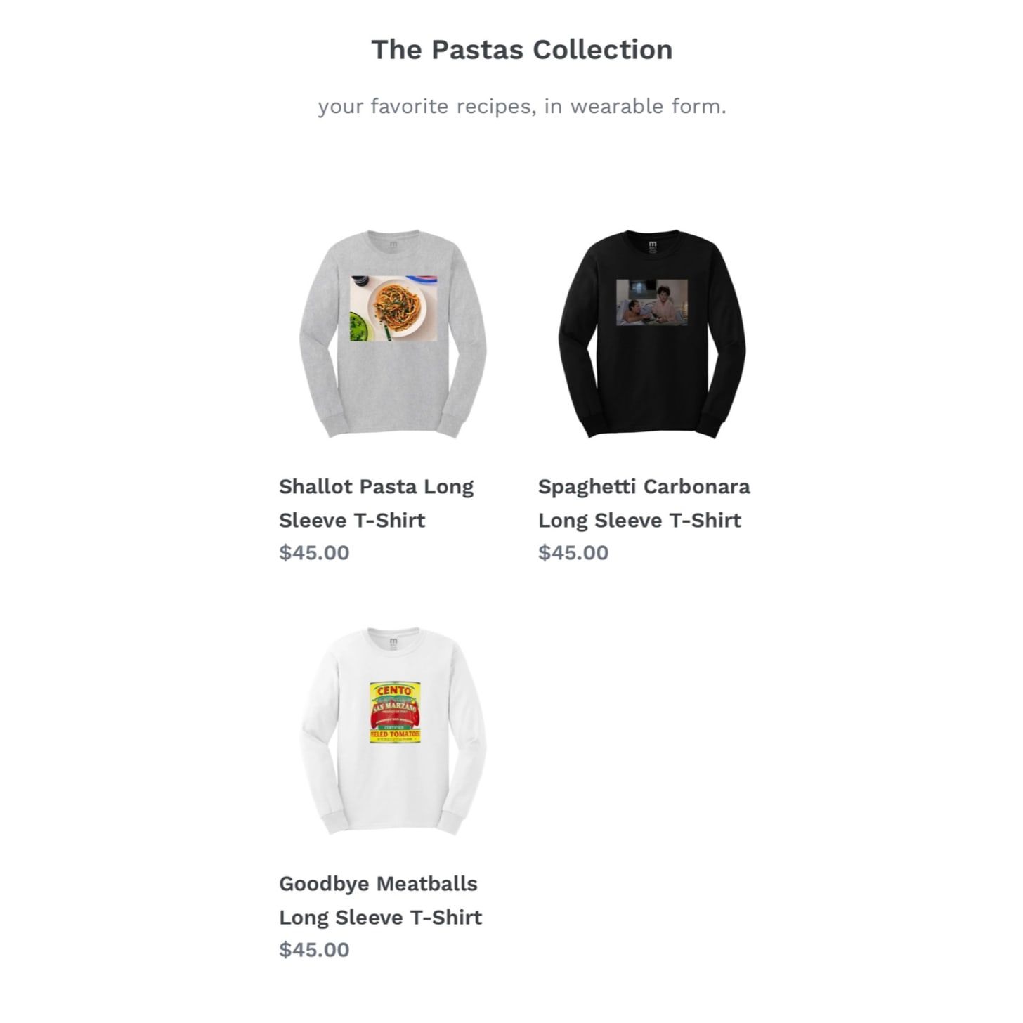 Please welcome The Pastas Collection, three of my favorite pastas, all wearable in their own ways. Shallot Pasta (now in a long-sleeve tee!), Goodbye Meatballs (hello, merch), and Spaghetti Carbonara (for one), photos on the front, recipes on the back.