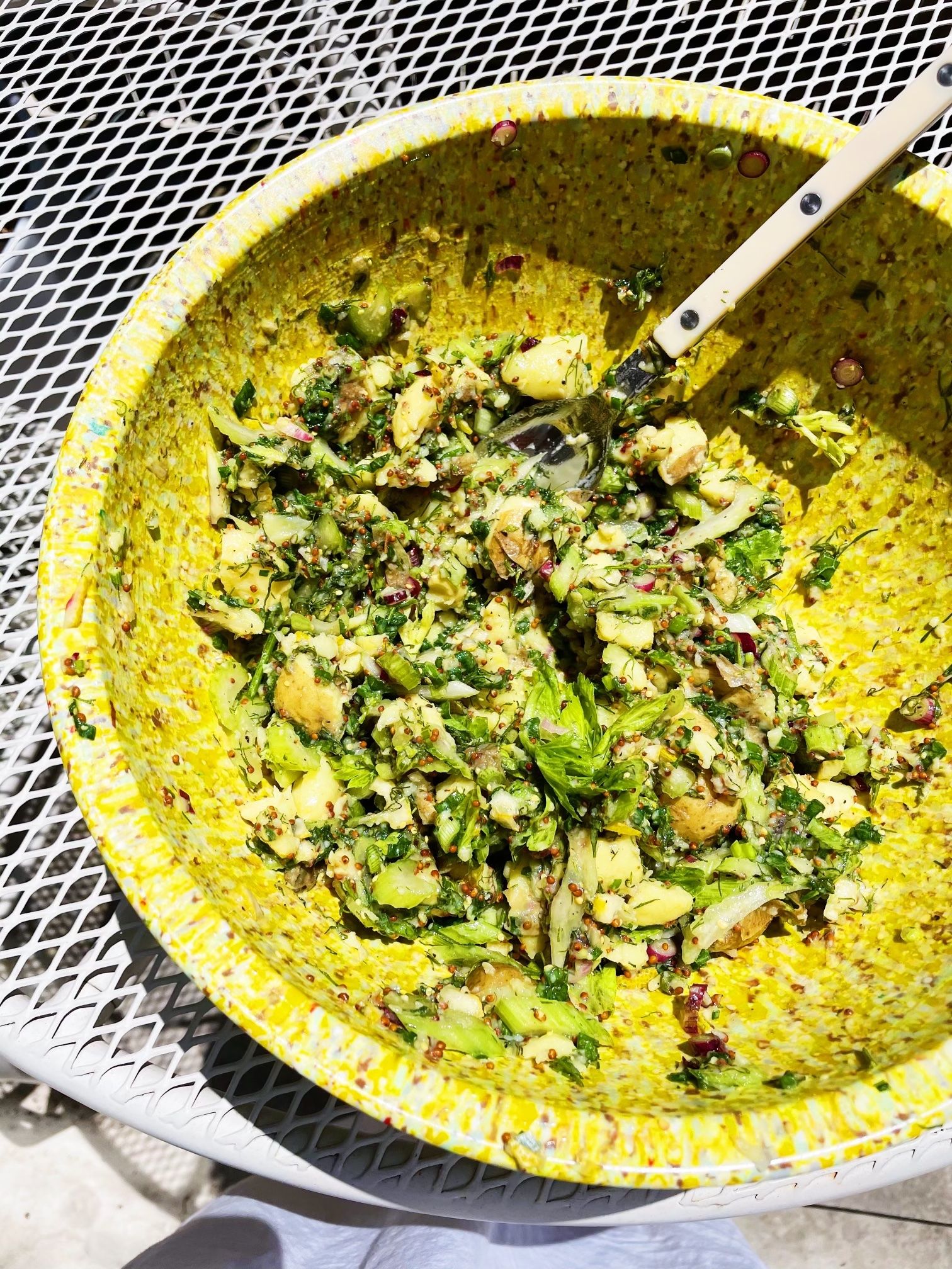 If you don’t have scallions, you can use a thinly sliced shallot, and if you happen to have a preserved lemon on hand, this is the perfect time to use it. This celery vinegar from TART is particularly delicious here (and in many other dishes, and also to drink and what we are saying is: BUY IT), but white wine or apple cider vinegar will absolutely do the trick. Warm potatoes absorb the dressing particularly well, but if you’re using pre-boiled potatoes, just let the salad sit a little longer and mix a little more intensely to get them properly dressed.